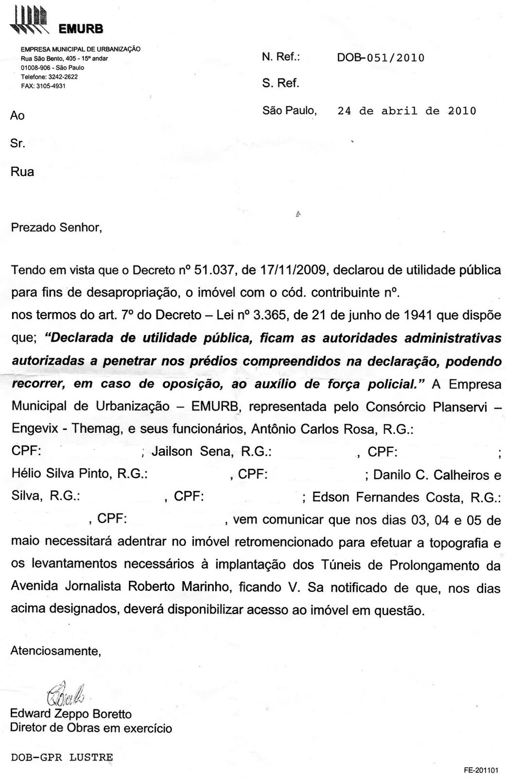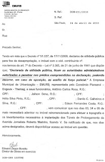 Segue a carta que citei no post abaixo , que a EMURB está enviando para os moradores: