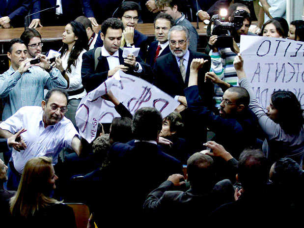 O prefeito reagiu primeiro com cautela, pedindo à segurança que tratasse os manifestantes com "dignidade". Depois, com a insistência das palavras de ordem, reagiu com ironia: "Uma salva de palmas para eles, e que viva a democracia". Os manifestantes chegaram a estender cartazes dizendo que a tarifa de R$ 3 é um roubo. As faixas foram rasgadas pela equipe de segurança da Assembléia
